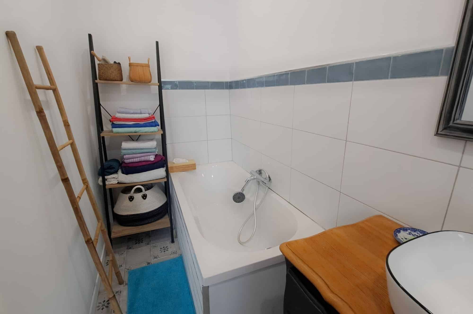 – au rez-de-chaussée : entrée, salon, belle cuisine équipée, salle de bain avec baignoire et douche, WC, cave.